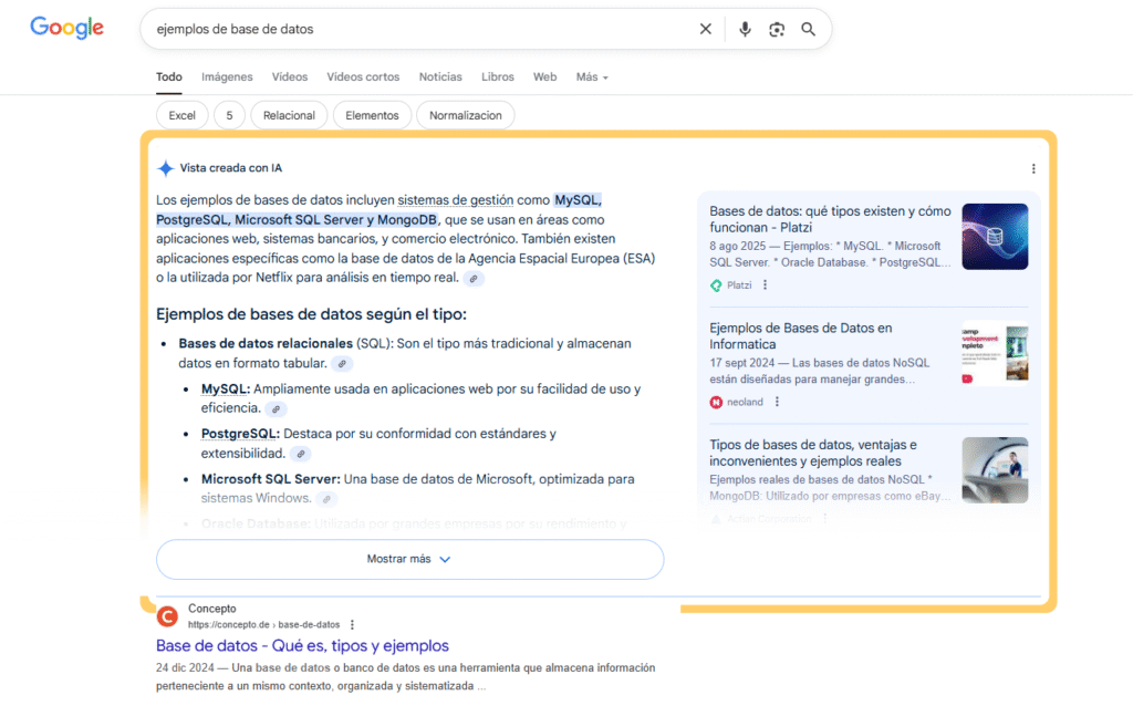 Resultado: lista de artículos que hablan del tema. Debes visitar varias páginas para sumar información. Además quedarán por debajo del bloque de la vista creada por IA.